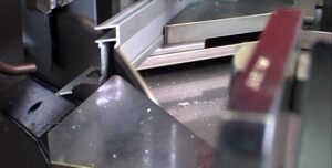 El perfil está bloqueado por un eje longitudinal que garantiza estabilidad y precisión durante cada operación. El módulo de corte está equipado con una cuchilla de Ø 500 mm con movimiento ascendente controlado por CNC, para cortes precisos y repetitivos a -45°, 90° y +45°.